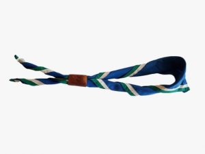 Nuestra pañoleta es de color azul con el ribete verde y blanco roto